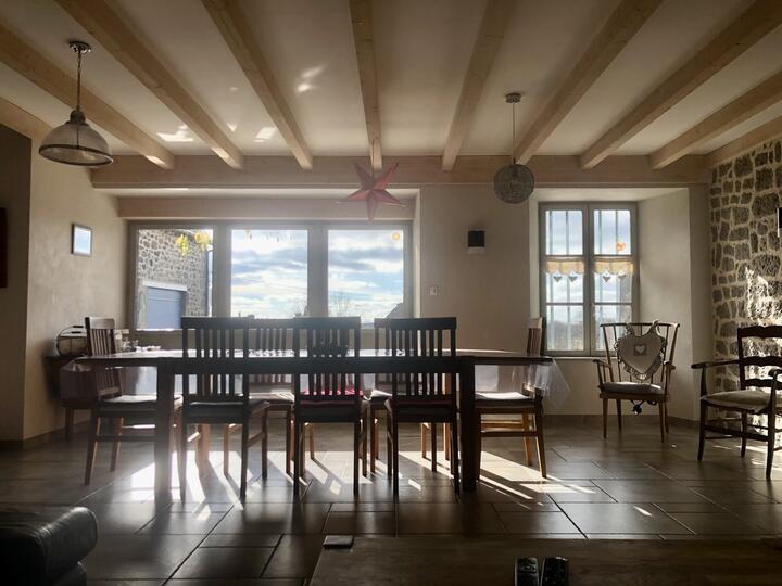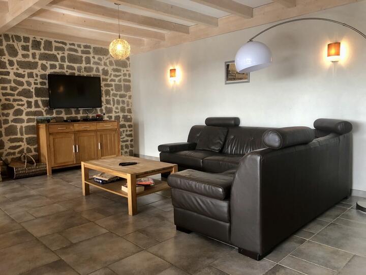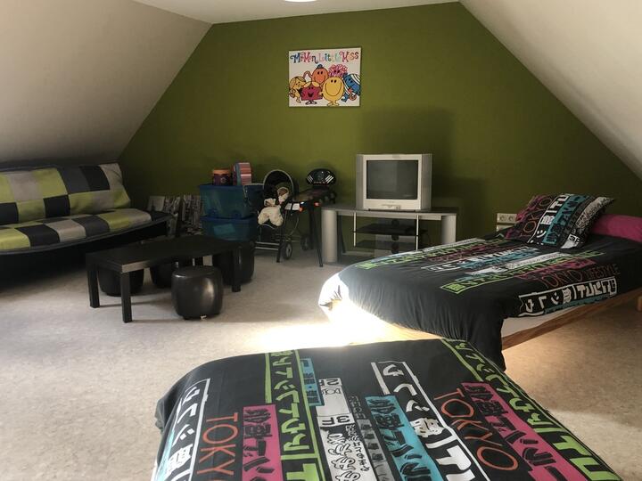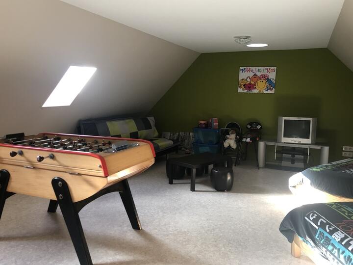 RdC : séjour spacieux avec cheminée, 3 chambre au 1er étage, salle de jeux avec babyfoot et 2 couchages au 2nd étage.