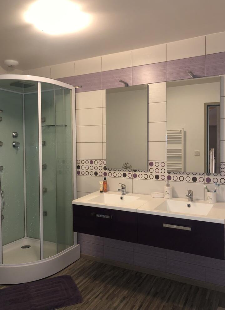 Aspirateur, Câble / Satellite, Chauffage, Matériel Bébé, Accès Internet privatif Wifi, Lit 140 cm, Cuisine, Cheminée / Poêle, Congélateur, Douche, Four, Lave linge privatif, Lave vaisselle, Réfrigérateur, Sèche cheveux, Télévision, Balcon, Toilettes séparées, 2 salles de bain (privées), Hotte aspirante, Lecteur DVD, Micro-ondes, Lit 90 cm, Lit bébé, Chaise bébé, Baignoire bébé