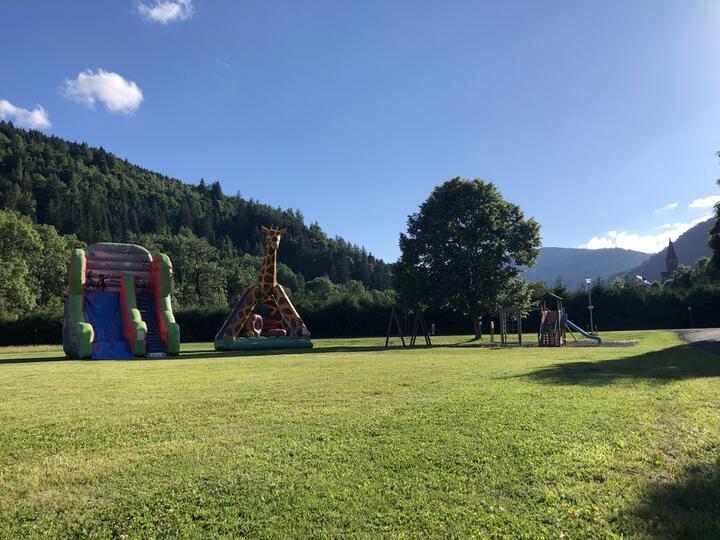 Camping vaste et semi-ombragé avec des sanitaires confortablement dimensionnés. Commerces de proximité à quelques mètres et piscine municipale qui jouxte directement le camping