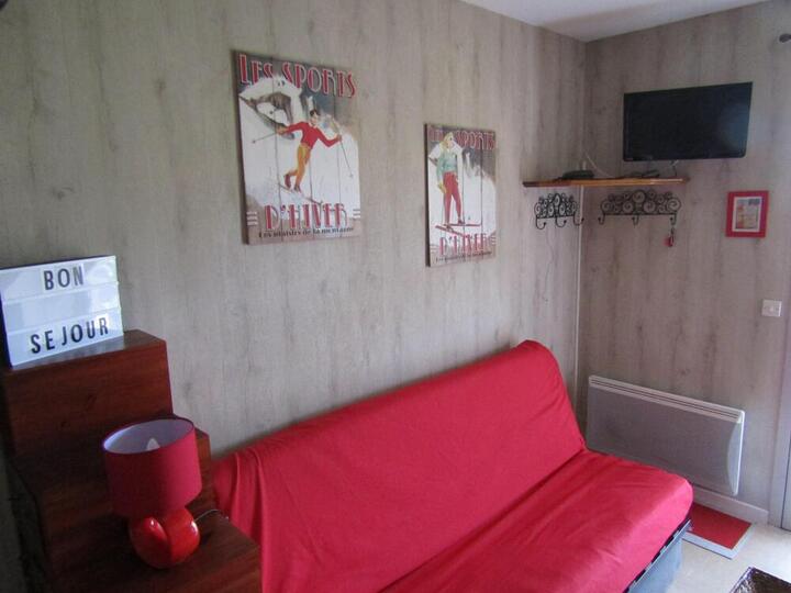 Résidence calme surplombant la station, à 10 min à pied du centre par la piste du "Rocher du Cerf", située à 150m de celle-ci. Ce studio tout confort donne directement sur l'extérieur avec une exposition plein sud.