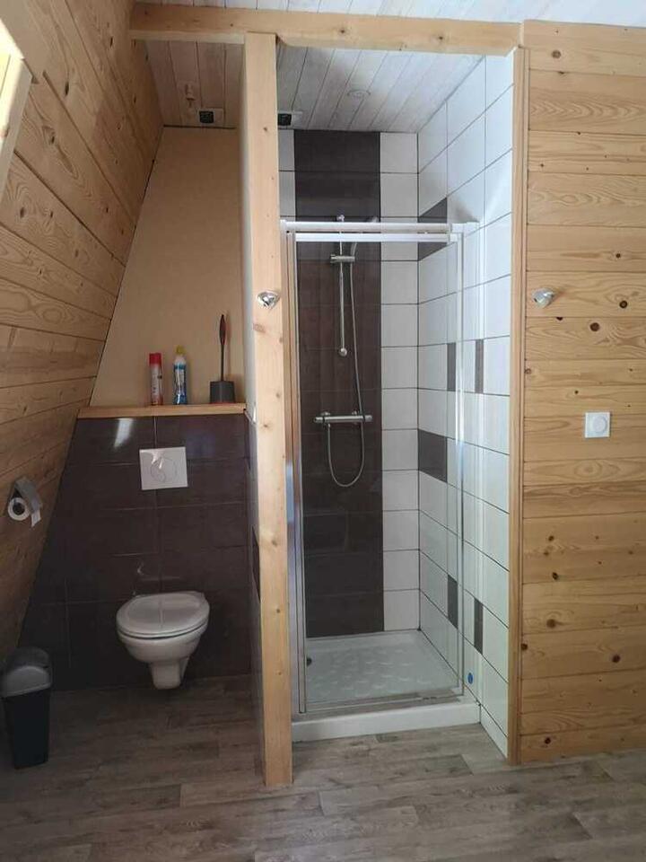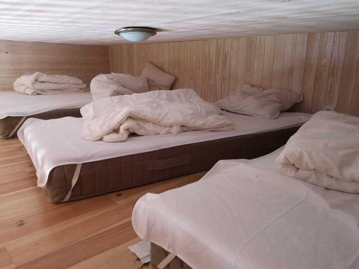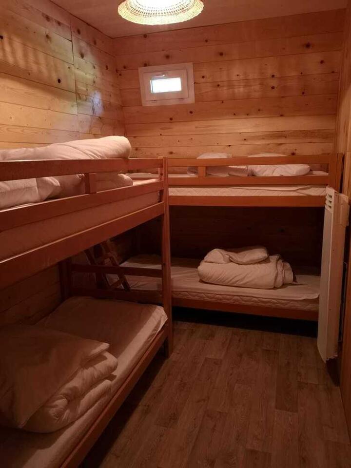 ch 1 : 1 lit en 140, une penderie - chambre 2 : 1 lit 140, une penderie, une douche et des WC séparés - ch 3 : 2 lits superposés - en mezzanine : 4 matelas séparés au sol.