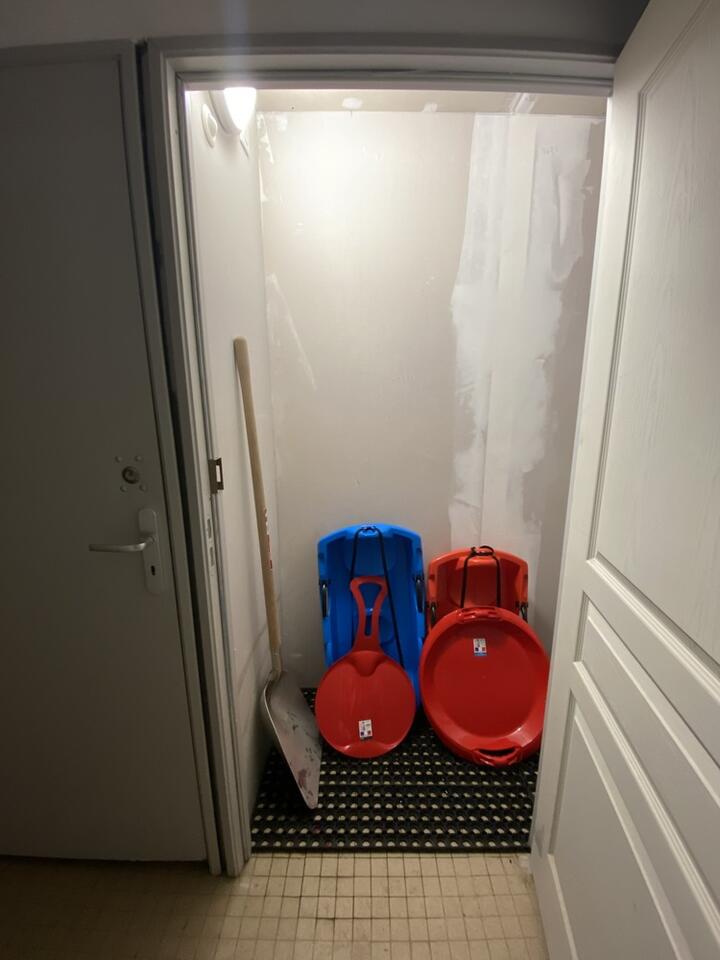 Local à ski portant le numéro 1 dans lequel des luges sont à disposition.